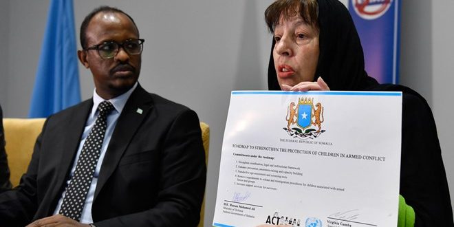 ووقع وزير الدفاع الصومالي اتقاقية خارطة طريق توضح بالتفصيل الإجراءات العملية لمنع الانتهاكات المرتكبة ضد الأطفال، بحضور الممثلة الخاصة للأمين العام للأمم المتحدة المعنية بالأطفال والصراع المسلح فرجينيا غامبا والتي تزور البلاد .