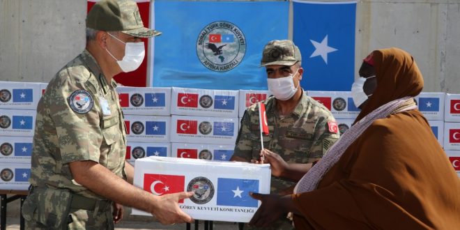 وقالت الوزارة في بيان، إن “قيادة القوات التركية-الصومالية التي تقوم بتدريب أفراد الجيش الصومالي في ثكنات الأناضول في العاصمة الصومالية مقديشو، قامت بتوزيع مساعدات غذائية على 300 أسرة صومالية محتاجة”.