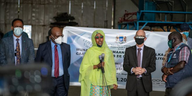 وكان في استقبال اللقاحات، وزيرة الصحة فوزية ابيكر حسن، والمبعوث الأممي الخاص للصومال جيمس اسوان، إضافةً إلى مسؤولين آخرين.