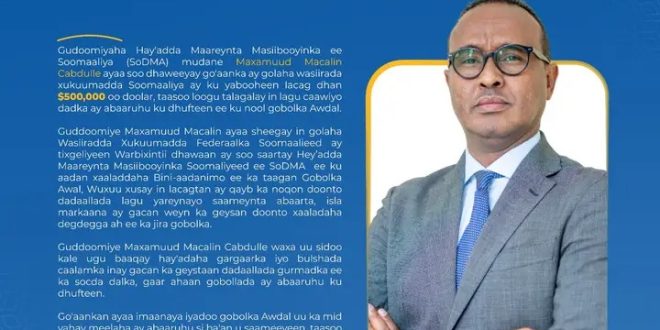 مقديشو — أشادت هيئة إدارة الكوارث الصومالية(صودما) بقرار مجلس الوزراء القاضي بتخصيص 500,000 دولار أمريكي كمساعدات إنسانية عاجلة للمتضررين من موجة الجفاف الحادة التي تضرب محافظة أودل شمال غرب البلاد.