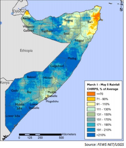 Rainfall started in March, two to four weeks earlier than normal, in many areas of Somalia, and heavy rainfall has persisted through early May. In several central, southern, and northwestern regions, the total quantity of rainfall received during the first two months of the season is the highest on record.