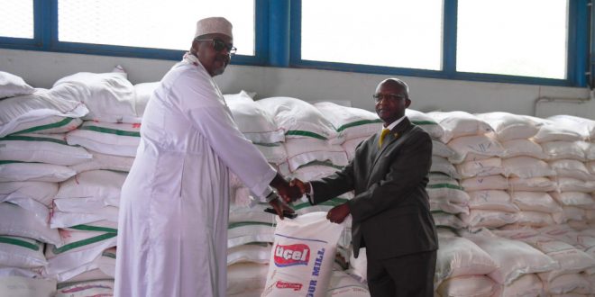 The lorry-loads of assorted food consisting of rice, wheat flour, sugar, cooking oil and milk, was delivered through the Ugandan AMISOM contingent.