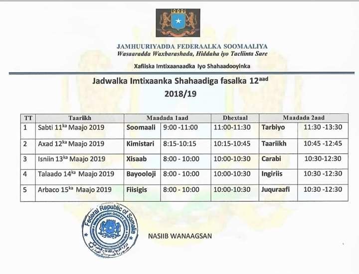 The Deputy Minister of Education Feysal Omar Guled, told the media that the 2018/2019 form four final exams will kick off on Saturday the 11th May 2019 and will run for five days.