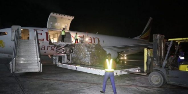 The materials, consisting of 6 million masks, 1.1 million kits, 60,000 sets of protective clothing, 60,000 protective masks and other items, arrived on Sunday in the Ethiopian capital, Addis Ababa.