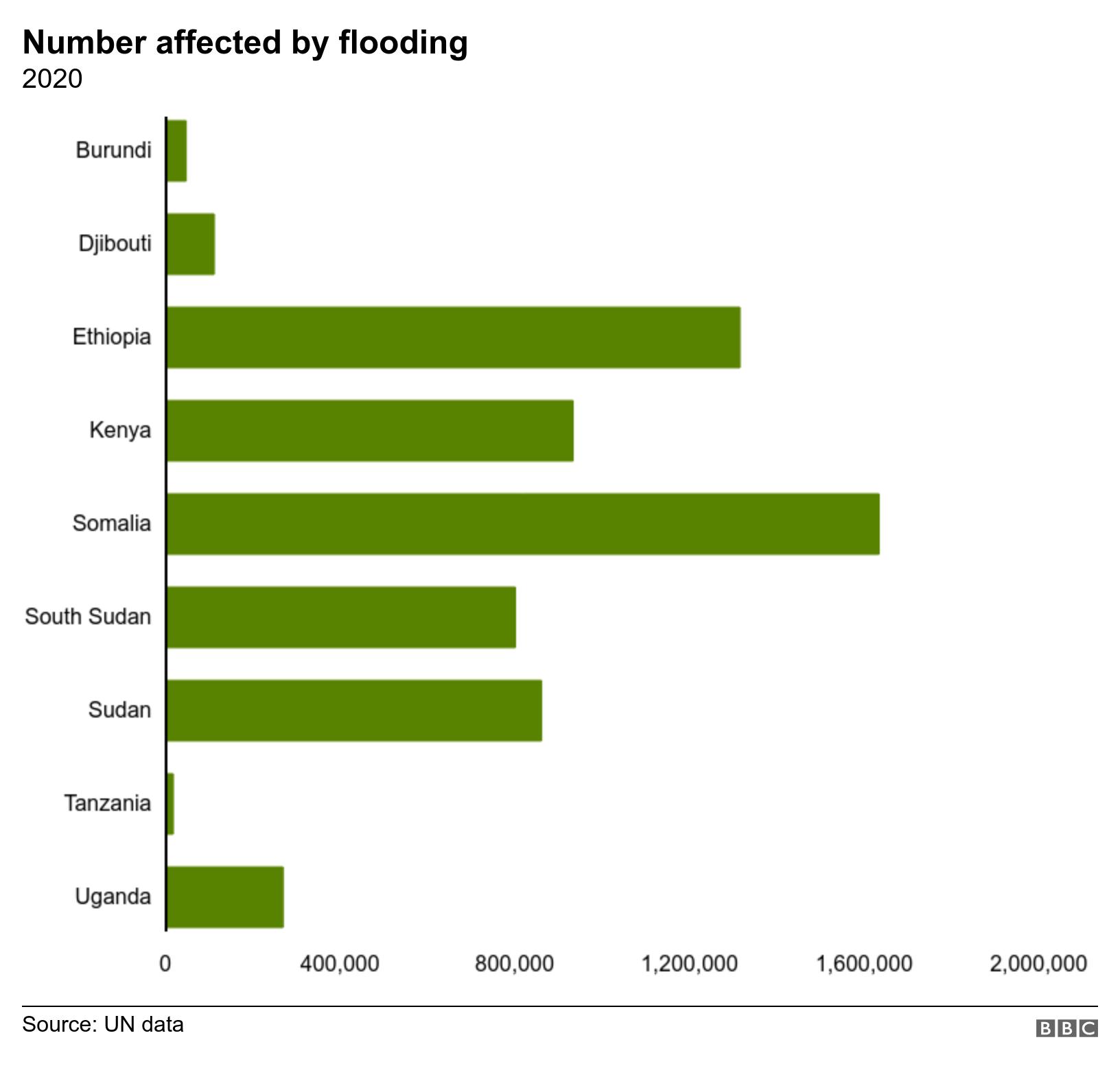 In Ethiopia, which has a much larger population, 1.1 million people have been affected by flooding.