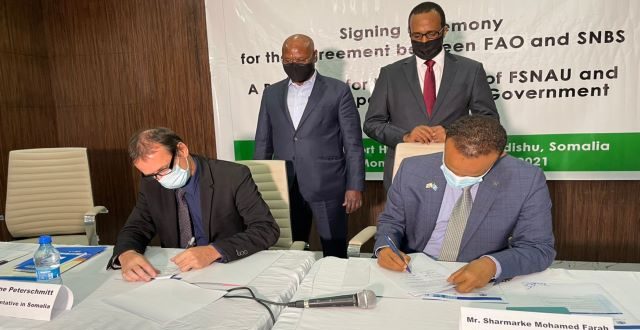 MOGADISHU — The Somalia National Bureau of Statistics (SNBS) of the Federal Republic of Somalia has signed a historic formal agreement with the Food and Agriculture Organization (FAO) of the United Nations to transfer the Food Security & Nutrition Analysis Unit (FSNAU) and the Somalia Water & Land Information Management (SWALIM) Programs from FAO to the SNBS. The transfer will happen through a three-phased approach that is expected to conclude within three years.