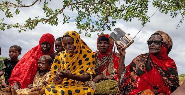 Famers listen to Radio Baidoa on their farm outside Baidoa district in Somalia on Monday November 2, 2020. FAO Somalia has launched an auxiliary long-distance training initiative through several Somali radio stations ​(including Radio Baidoa) on good agricultural practices, livestock, fishery and nutrition, targeting farmers, pastoralists and fishermen across the country. OSRO/SOM/908/USA - Arete / Ismail Taxta / FAO Somalia